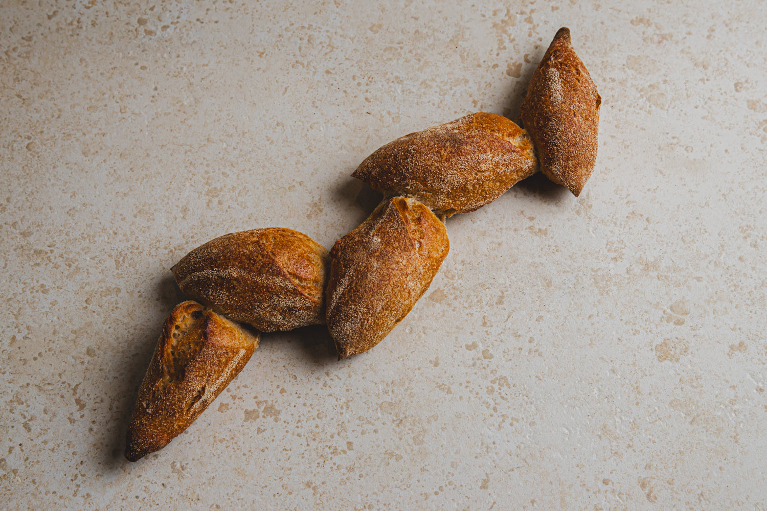 It's made from our baguette dough. Before baking, we cut the dough with scissors at an angle and pulls each section to the side.